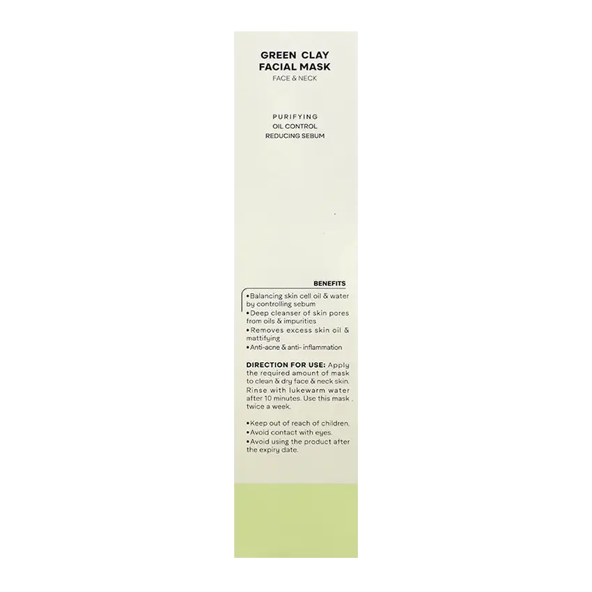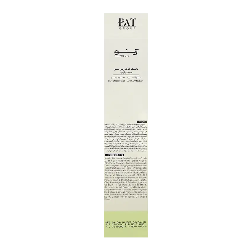 کائولین – بنتونیت و اکسید کروم سبز (کد رنگ ۷۷۳۸۸) – بوتیلن گلیکول – اتیل هگزیل استئارات – سدیم هیالورونات کراس پلیمر – پلی گلیسریل ۴ دی ایزو استئارات / پلی هیدروکسی استئارات / سباسات – سدیم ایزو استئارات – پروپیلن گلایکول – سرکه سیب – عصاره میوه لیمو – گلیسریل استئارات و پیایجی ۱۰۰ استئارات – منیزیم آلومینیوم سیلیکات – پلی گلیسریل ۲ دیپلیهیدروکسی استئارات – خاک رس – فنوکسی اتانول – اتیل هگزیل گلیسیرین – سدیم پلیاکریلات – تریدس ۸ – اسید سوکسینیک و مالتودکسترین – اتیل تریمونیوم کلراید متاکریلات کوپلیمر – پروتئین گندم هیدرولیز شده – عصاره برگ آلوئهورا – دیسدیم EDTA – کد رنگ ۴۲۰۹۰ + ۱۹۱۴۰ – آب دیونیزه