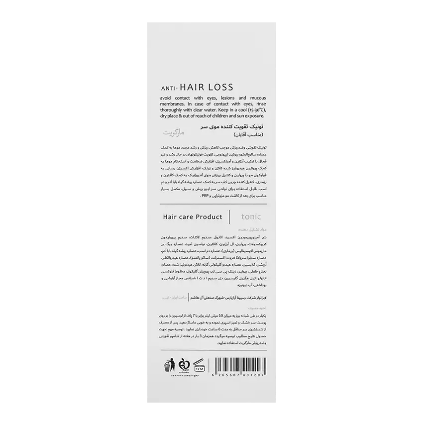 دی آمینوپیریمیدین اکسید – اتانول – سدیم لاکتات – سدیم پیرولیدون کربوکسیلات – پرولین ال – آرژنین – کافئین – نیاسین آمید – عصاره برگ رز ماریتوس افیسینالیس (رزماری) – عصاره دم اسب – عصاره ریشه گیاه بابا آدم – عصاره سرنوا سرولاتا فروت اکسترکت (سائو پالمتو) – عصاره هیدروالکلی آویشن – گلایسین – عصاره هیدروگلیکولی گزنه – کلاژن هیدرولیز شده – عصاره نعناع فلفلی – بیوتین – زینک پی سی ای – پروپیلن گلیکول – مخلوط فنوکسی اتانول – اتیل هگزیل گلیسرین – دی سدیم ادتا – اسانس مجاز آرایشی و بهداشتی – آب دیونیزه