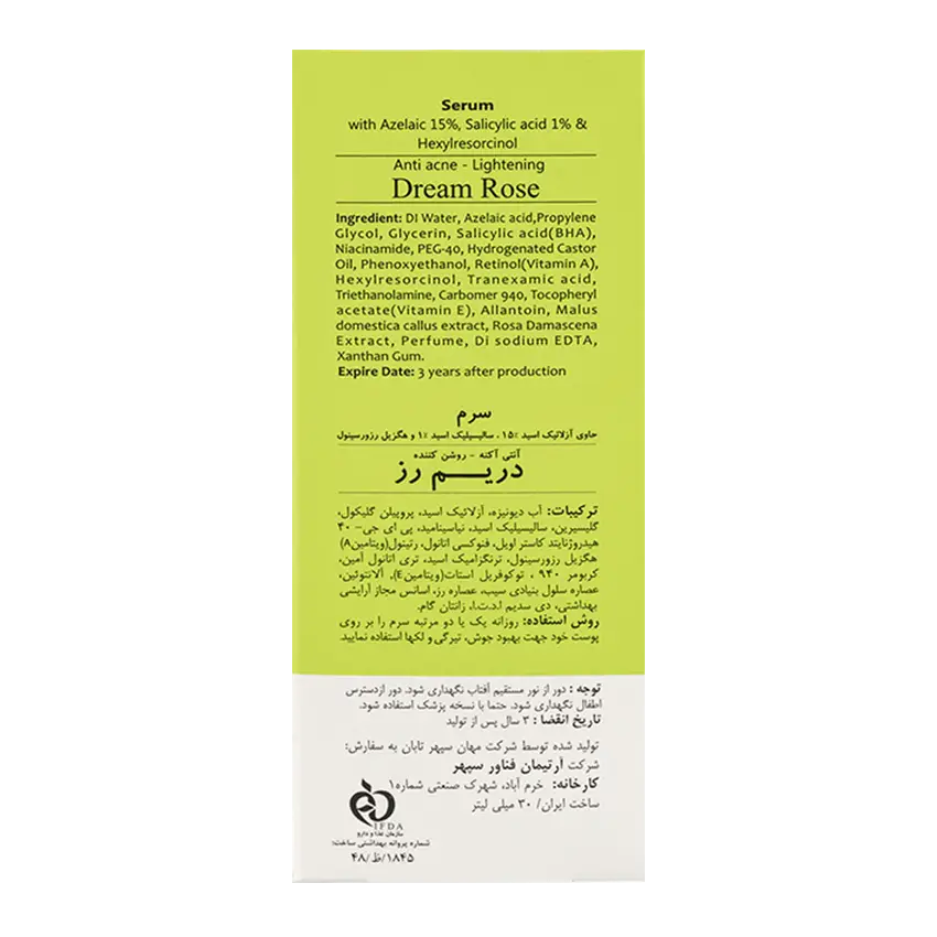 سرم ضد جوش آزلائیک اسید 15% و سالیسیلیک اسید 1% دریم رزDream Rose Azelaic Acid And Salicylic Acid And Hexyl Resorcinol Serum