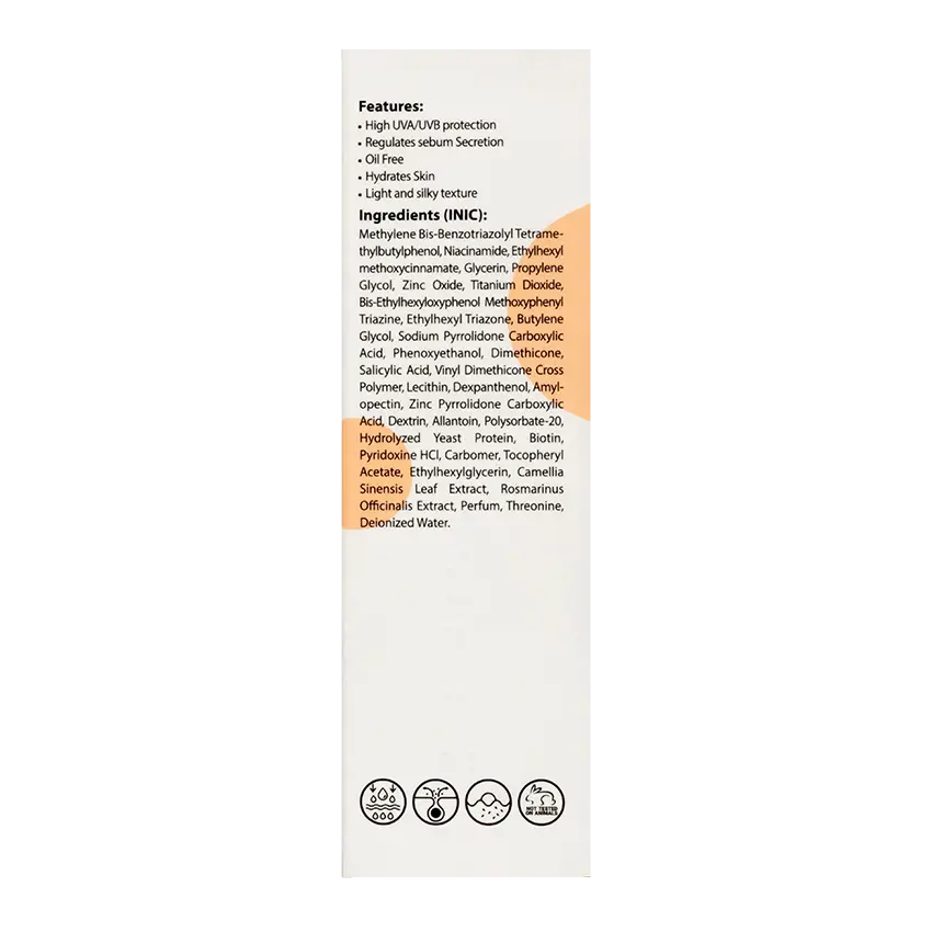 متیلن بیس بنزوتریازولیل تترا متیلبوتیلفنول – نیاسینامید – اتیل هگزیل متوکسیسینامات – گلیسیرین – پروپیلن گلیکول – اکسید روی – دیاکسید تیتانیوم – بیس اتیل هگزیل اوکسیفنول متوکسیفنیل تریازین – اتیل هگزیل تریازون – بوتیلن گلیکول – سدیم پیرولیدون کربوکسیلیک اسید – فنوکسیاتانول – دیمتیکون – اسید سالیسیلیک – وینیل دیمتیکون کراس پلیمر – لسیتین – دکسپانتنول – آمیلوپکتین – زینک پیرولیدون کربوکسیلیک اسید – دکسترین – آلانتوئین – پلیسوربات ۲۰ – پروتئین هیدرولیز شده مخمر – بیوتین – پیریدوکسین HCl – کربومر – توکوفریل استات – اتیل هگزیل گلیسیرین – عصاره چای سبز – عصاره رزماری – عطر – ترئونین – آب دیآیونیزه